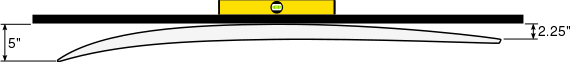 Bottom rocker is usually measured along the stringer, with the center of a long, leveled straight edge placed at the apex of the rocker as the board is centered on the shaping racks, bottom up. The distance between the leveled stick and the board's bottom is measured. Measurements are typically taken at the nose and tail endpoints, but also at a number of points along the length of the board. The more measurements taken, the more accurately the rocker curve can be described. For example, typical modern performance shortboards have about 5 inches of nose rocker at the tip of the nose, and about 2 1/4 inches of rocker at the tip of the tail, with more variation found in the former than that latter.